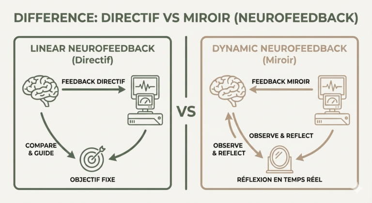 Le Neurofeedback linéaire (ou médical) cible l’amélioration d’un ou plusieurs paramètres spécifiques (comme l’amplitude des ondes cérébrales), tandis que le Neurofeedback Dynamique vise à optimiser l’autorégulation en temps réel de la complexité du réseau cérébral.